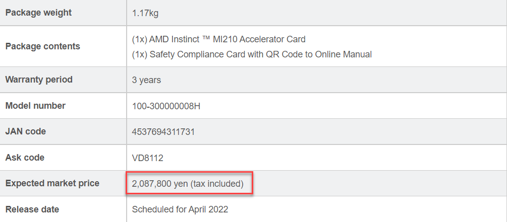 Официально цену и сроки появления AMD не называла, но в Японии ускорители уже заметили у одного из поставщиков. В каталоге компании Ask-corp MI210 предлагаются по цене более 2 млн иен с учётом местных налогов. Это примерно 16500 долларов США. Сравнение с потребительскими игровыми видеокартами некорректно, но для общего представления можно отметить, что продвинутые версии NVIDIA GeForce RTX 3090 Ti стоят в три раза дешевле.