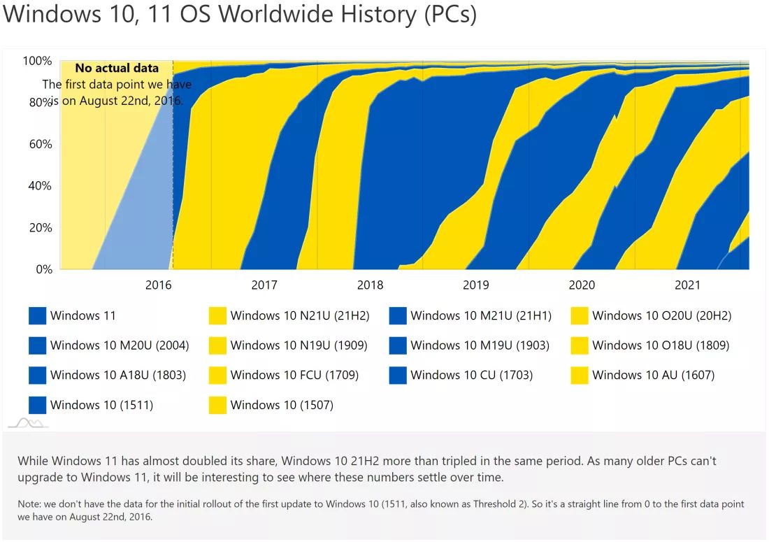 На диаграмме AdDuplex показаны темпы распространения разных версий Windows с 2016 года. Windows 11 в крайнем правом углу выходит на плато намного раньше прочих сборок, пишет Techspot.