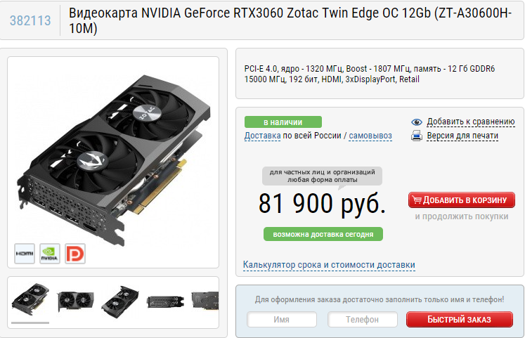 Не менее интересна Radeon RX 6700 XT. Во многих сценариях модель производства MSI будет демонстрировать уровень более дорогой GeForce RTX 3070. Нужно поманить, что у последней есть козырь в виде трассировки лучей. И вообще далеко не все наши читатели готовы покупать графические чипы AMD. Если вы принадлежите к их числу, то вам либо придётся переплачивать, либо брать GeForce RTX 3060. С этим графическим чипом творятся какие-то чудеса. Неделю назад он ощутимо подешевел, а после снова начал дорожать. Мы не можем назвать причин этого явления, но сегодня можно купить модель производства Zotac за 82 тысячи. Запускать игры в 2К всё ещё можно, но если смотреть в будущее, то удел GeForce RTX 3060 – это уверенные показатели в разрешении 2К.
