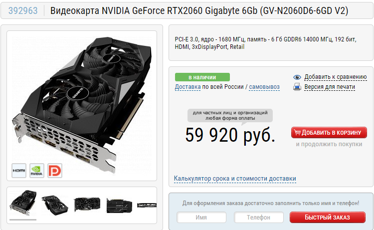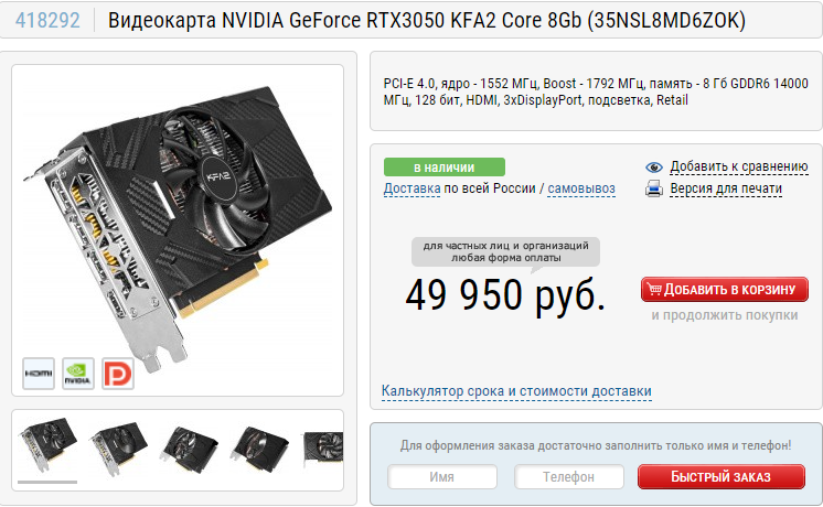 В качестве альтернативы предлагаем присмотреться к GeForce RTX 2060. Это модель предыдущего поколения отлично справляется с играми в 1080р и ещё долго будет радовать своего владельца отличными показателями и высоким fps. Единственное, что вас может остановить – это цена в 60 тысяч рублей. Вот только более дешёвые модели уже похуже. Ну и на сладкое GeForce RTX 3050. За прошедшие недели российские геймеры буквально устроили охоту на этот графический чип, что привело к тому, что многие магазины начали предлагать модели дороже 55 тысяч рублей. В Регарде можно найти карту производства KFA2 за 49 950 рублей. Отличный вариант для тех, кто собрал всего 50 тысяч, но хочет получить максимум от современных игр в 1080р.