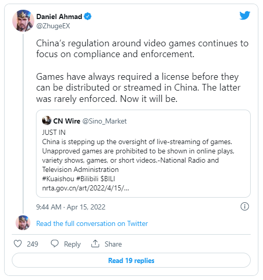 Регулирование и контроль в отношении видеоигр в Китае по-прежнему остаются достаточно жесткими. С точки зрения законодательства, распространение и трансляция игр без соответствующей лицензии на территории страны вовсе не допускались, однако второе не всегда соблюдалось. Теперь, по всей видимости, органы станут пристальнее следить за игровыми трансляциями.