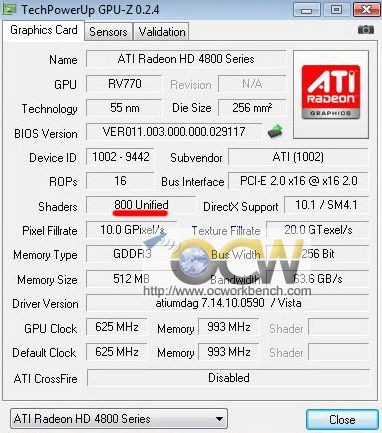 Однако, начать наше знакомство с эталонной версией Radeon HD 4850 мы бы хотели со скриншота GPU-Z, опубликованного на страницах сайта OC Workbench. Мы можем в очередной раз убедиться, что 55 нм видеочип RV770 имеет 800 шейдерных процессоров и 256-битную шину памяти, а видеокарта Radeon HD 4850 оснащается 512 Мб памяти типа GDDR-3, и работает на частотах 625/1986 МГц.