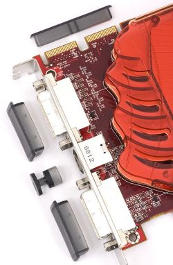 Разъёмы для подключения мостиков CrossFire и порты на задней панели снабжаются специальными защитными пластиковыми колпачками. Казалось бы, мелочь, а приятно. Результатами тестирования данной видеокарты указанный ресурс обещал поделиться позднее.