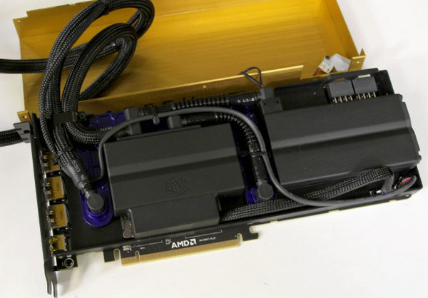 Итак, под кожухом видеокарты AMD Radeon Vega Frontier Edition скрывается весьма интересная система жидкостного охлаждения производства Cooler Master. Слева разместилась помпа с водоблоком, охлаждающим графический процессор и расположенные с ним рядом микросхемы памяти HBM2, а также водоблок, отводящий тепло от элементов подсистемы питания (синего цвета). Охлаждающая жидкость от 120-мм радиатора толщиной 38 мм, поступает изначально к графическому процессору и памяти, а затем идёт уже к элементам питания, откуда возвращается в радиатор.