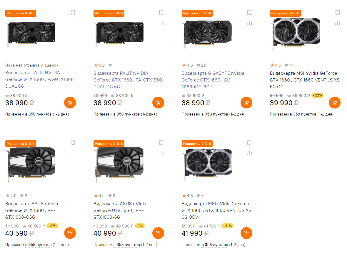 Предположим, что у вас в кармане всего 40 000 рублей. Можно отправится в Ситилинк, где есть огромный выбор видеокарт серии GeForce GTX 1660. Они неплохо справляются с новыми играми, вот только вам придётся мириться со средними настройками графики даже в разрешении 1080р. Мечтать о покупке монитора с разрешением 2К и тем более 4К в данном случае не стоит, поскольку там придётся снижать настройки до самых низких. Кому-то такая карта может показаться отличным выбором, но есть и более интересные предложения.