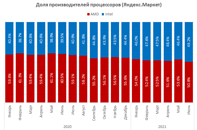 В начале 2020 года казалось, что AMD не просто набирает обороты, но и уже вскоре вытеснит Intel с российского рынка. Продажи процессоров увеличивались, а серия Ryzen 3000 расходилась как горячие пирожки. Наиболее интересен был Ryzen 5 3600, который позволял получить доступ к полноценным шести ядрам и двенадцати потокам за сумму меньше 200 долларов. На тот момент Intel находилась в роли догоняющего, с большим трудом подтягивая свой 14-нм техпроцесс до невероятно высокой планки, которую задали красные. Первые сомнения в способности AMD удержать 60% доли рынка стали одолевать экспертов после того, как осенью продажи упали, а уже в октябре вышло новое поколение Ryzen 5000. Несмотря на прорывную архитектуру Zen 3, высокие тактовые частоты и невероятные показатели в играх массовый покупатель ждал чего-то иного.