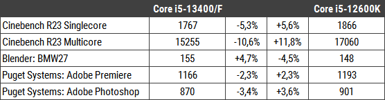 Всё-таки больший теплопакет и частоты делают i5-12600K лидером, в однопотоке Cinebench R23 модель на 5,6% быстрее, в многопотоке на 12%, на 5% меньше времени занял рендеринг сцены BMW27 в Blender, а в сценариях Puget Systems для Adobe Premiere и Photoshop процессор получил оценки на 2% и 4% больше соответственно, по сравнению с i5-13400. Преимущество i5-12600K было очевидным, но далеко не везде оно значительное, конечно, i5-12600K можно разогнать, но стоимость сборки под разгон существенно выше и по соотношению производительности к цене i5-13400 смотрится интереснее.