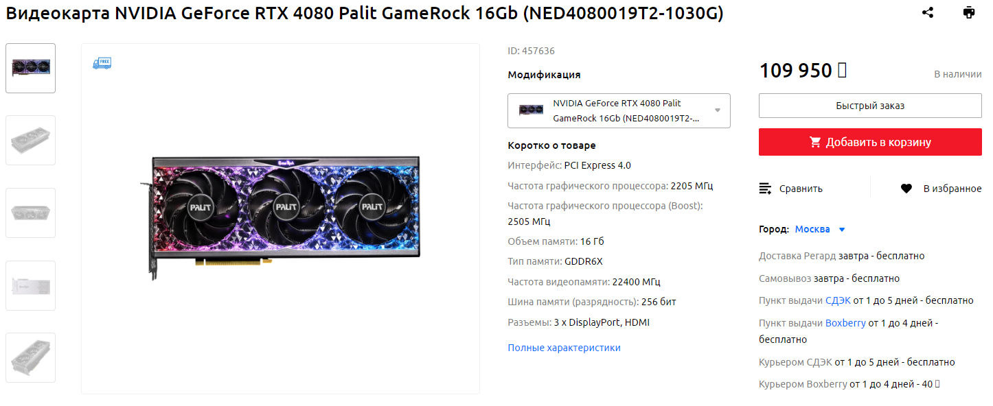 Подорожали в «Ситилинке» и различные версии RTX 4080, а вот в «Регарде» их стоимость пока держится – новенькую видеокарту с завышенной самой NVIDIA ценой можно приобрести менее, чем за 110 тысяч рублей. Недооценивать карточку, впрочем, не стоит – она не только гораздо производительнее, чем RTX 3090 и RTX 3090 Ti, но и гораздо энергоэффективнее. Если для гейминга на максимальных настройках в разрешении 4K лучше взять RTX 4090, то для QuadHD отличным вариантом, обеспечивающим большой запас производительности, будет «четыре тысячи восьмидесятая».