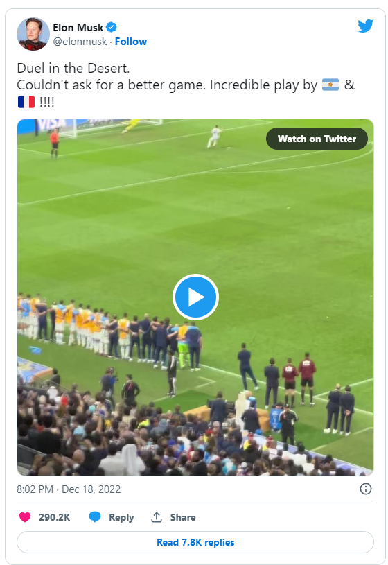 Основатель SpaceX, Tesla и с недавних пор единоличный владелец Twitter - Илон Маск, посетил финальный матч чемпионата по футболку между Аргентиной и Францией, проходящий в арабской стране Катар. Внезапный визит миллиардера сопровождался постами в его Twitter аккаунте, где он обновлял счёт между командами и выкладывал фотографии с трибун, котроткие видео.