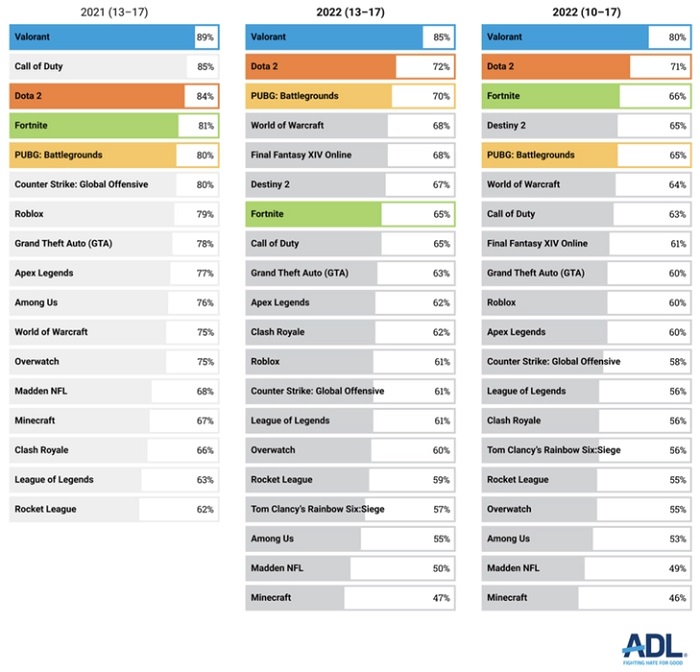 Оказалось, что среди геймеров в возрасте от 10 до 17 лет (почему-то ADL проводила опрос именно среди них; видимо, как среди наиболее обидчивых представителей поколения кристаллизованных капелек воды) самыми «токсичными» играми являются Valorant, Dota 2 и Fortnite. Следом за ними с небольшим отставанием идут Destiny 2, PUBG, World of Warcraft и Call of Duty. По статистике, в каждом из этих проектов с той или иной формой «токсичности» сталкиваются от 63 % до 80 % респондентов.
