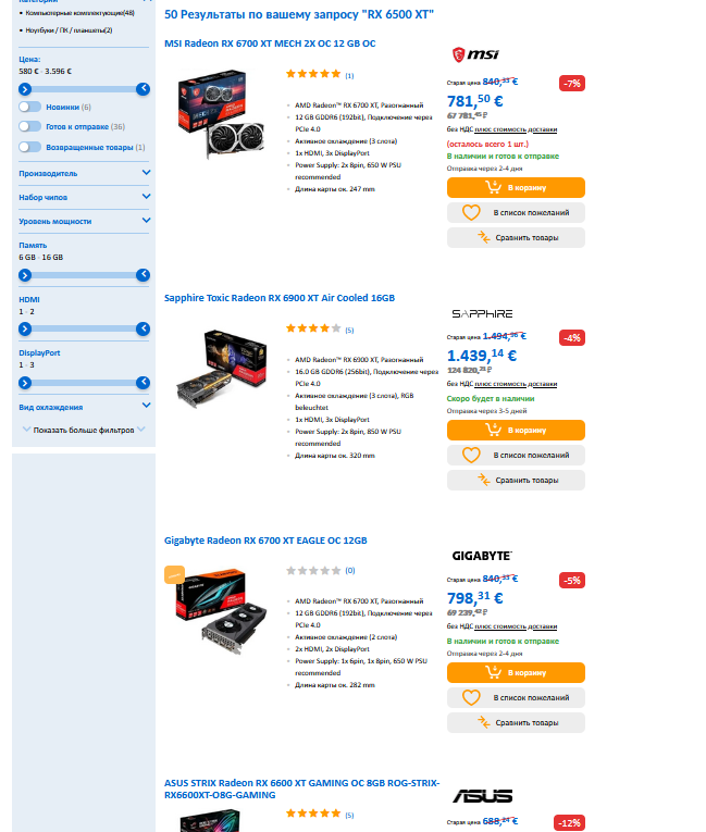 Ничуть не лучше дела обстоят и в Европе. К примеру, поиск по запросу Radeon RX 6500 XT в CU выдаёт всё что угодно, кроме Radeon RX 6500 XT. А попытка отыскать карту среди запасов немецкого магазина MindFactory приводит пользователя на страницу PowerColor Radeon RX 6500XT Fighter, где снова красуется надпись "нет в наличии".