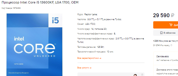 Если остановиться на сегменте до 30 тысяч, то самым быстрым решением на рынке является Core i5-13600KF. Процессор хорош как в играх, так и в рабочих задачах, но особенно интересен он станет именно для геймеров. Если у вас есть деньги, то можно опробовать разгон. Мы не советуем этого делать, ведь материнская плата под такой камень обойдётся вам дороже 20 тысяч, а выгода от дополнительных 200 мегагерц будет стремиться к нулю. Именно поэтому оптимальным решением будет покупка недорогой материнской платы и оперативной памяти. Пусть Core i5-13600KF работает в штатном режиме, а вы лучше потратьте лишние деньги на видеокарту.