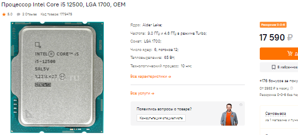Core i5-12500 не пользуется бешеной популярностью у геймеров, но обладает повышенными тактовыми частотами и может предложить неплохое соотношение между быстродействием и стоимостью. Проще говоря, если вы решили купить видеокарту уровня GeForce RTX 3060, то брать камень дороже нет никакого смысла. Core i5-12500 имеет минимальные требования к теплопакету, поэтому позволит вам собрать достаточно мощную систему, которая не будет напрягать ваши уши.