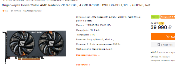 Если вы хотите купить мощную видеокарту для 2К и 1080р, то обратите внимание на Radeon RX 6700 ХТ. Мощности у данного графического чипа хватит на несколько лет вперёд, а сам он выгодно отличается от конкурентов количеством видеопамяти. Для народного разрешения это заявление не является актуальным, ну а благодаря скидкам вы можете купить Radeon RX 6700 ХТ дешевле 40 тысяч рублей. Предложение выгодное, при этом видеокарта быстрее GeForce RTX 3060 Ti.