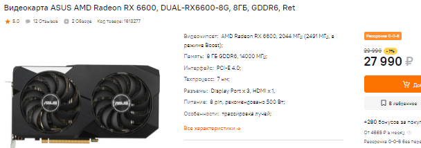 А вот Radeon RX 6600 за 28 тысяч смотрится в своём ценовом сегменте комфортно. Эта видеокарта слегка дороже GeForce RTX 3050, но обходит графический чип NVIDIA в играх с огромным отрывом. Не все геймеры умеют прислушиваться к голосу разума, поэтому Radeon RX 6600 имеет мизерные продажи, а представители красного лагеря ничего не делают для её популяризации.