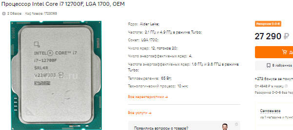Если вы не хотите переплачивать за материнскую плату и оперативную память и в целом рассчитываете на быструю, но недорогую систему с видеокартой до 40 тысяч рублей, то самое время присмотреться к Core i7-12700F. Этот процессор изначально лишён разгонного потенциала, поэтому будет оставаться холодным в любых ситуациях. Высокая тактовая частота обеспечит достаточный для разрешения 2К уровень быстродействия, а сам Core i7-12700F не ударит лицом в грязь даже перед самыми сложными задачами.