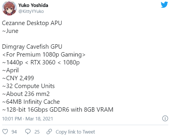 KittyYYuko подтверждает некоторые характеристики Navi 23, опубликованные Igor’sLAB в декабре прошлого года. Внутреннее кодовое имя для графических процессоров Navi 23 носит название Dimgrey Cavefish, и мы уже могли видеть это имя в нескольких строках кода Linux и macOS. Новая модель будет иметь 32 вычислительных блока с 2048 потоковыми процессорами, что на 25% меньше, чем у Navi 22. Размер кристалла чипов Navi 23 будет 236 мм², то есть примерно на 100 мм² меньше, чем у чипов Navi 22. Navi 23 также ограничен 64 МБ Infinity Cache и получит максимум 8 ГБ видеопамяти GDDR6 со скоростью 16 Гбит/с со 128-битной шиной.