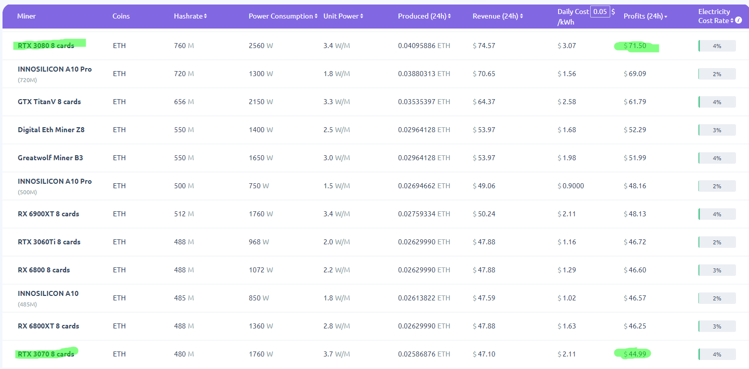 Но мы с вами вернёмся к окупаемости видеокарт. Для подсчётов будем использовать текущие цены в магазинах РФ. У вас ведь нет знакомых среди региональных поставщиков, которые готовы сделать скидку в 500 долларов? GeForce RTX 3070. В данном случае мы возьмём самую дешёвую версию, которая стоит 132 тысячи рублей. Посчитаем её реальную окупаемость. В сутки одна ферма из восьми таких карточек способна генерировать 45 долларов. После некоторых математических операций получаем месячную прибыль на одну карту в районе 170 долларов. Вот только наша GeForce RTX 3070 стоит немалые 1800 долларов, а значит откупить столь дорогую модель даже при сверхвысоком курсе Эфира не представляется возможным.