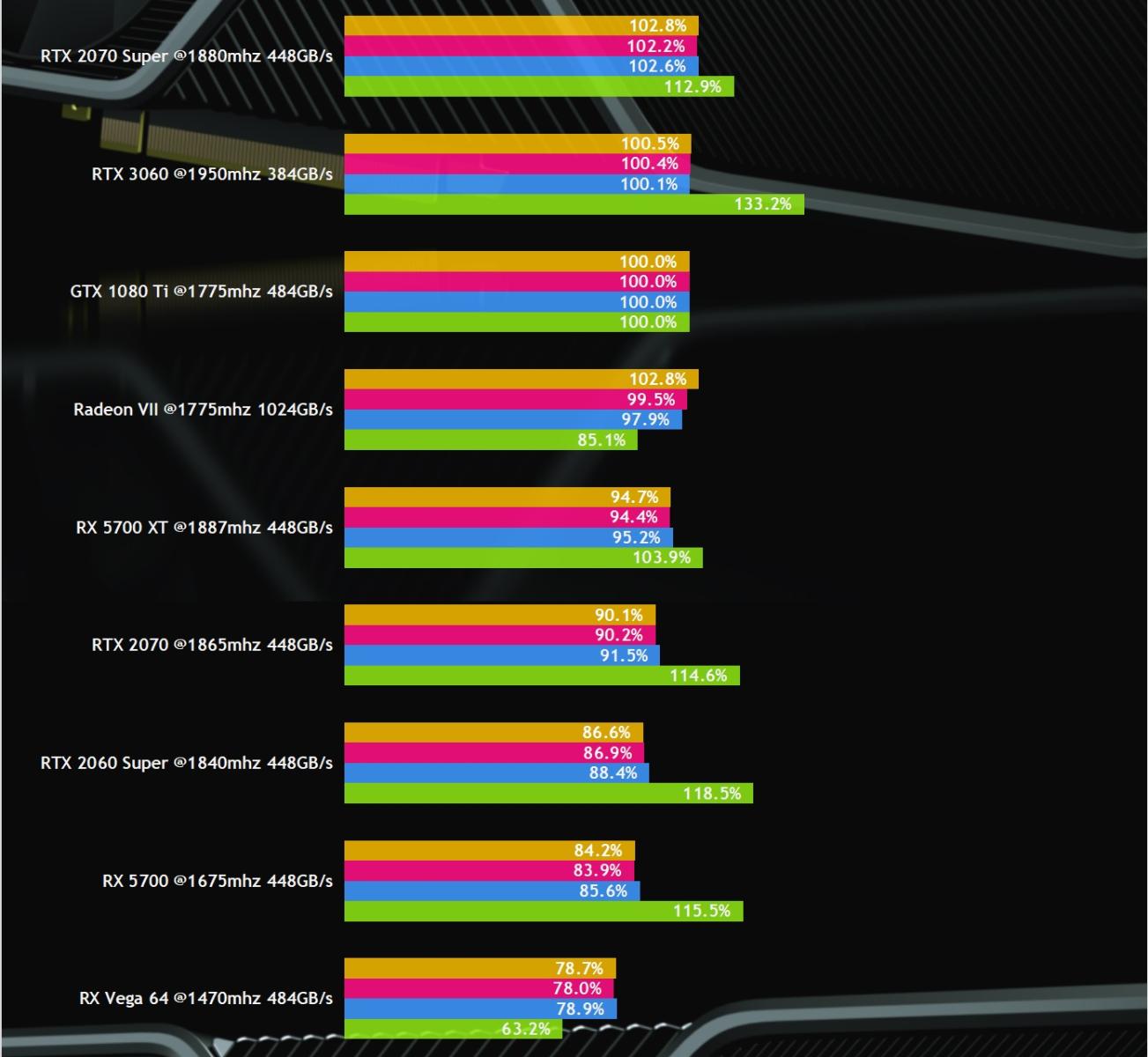 Чуть ниже расположилась GeForce RTX 3070 — судя по графику, новинка опережает GTX 1080 Ti на 23,3-29,1 %, в то время как наиболее доступная в представленной линейке RTX 3060 практически равна флагману поколения Pascal.