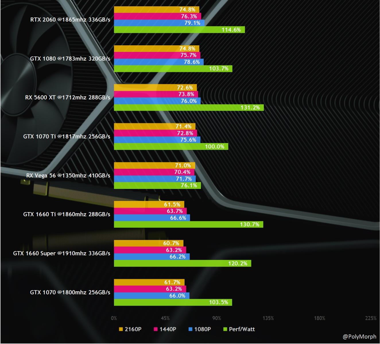 Несколько дней назад один из энтузиастов форума Chiphell, известный под ником PolyMorph, решил составить рейтинг производительности видеокарт текущих поколений, сравнив их уровень с предполагаемыми достижениями графических продуктов поколения Ampere, а сегодня представил обновлённый график, учтя некоторые недочёты.