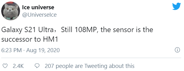 Первая утечка о Galaxy S21 Ultra рассказывает о новой камере разрешением 108 мегапикселей, которая станет обновлением датчика HM1, установленного в актуальном флагманском смартфоне Galaxy S20 Ultra.