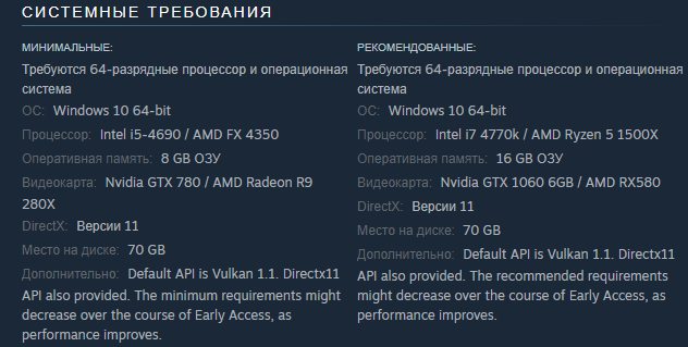 С рекомендованными требованиями также не возникнет проблем. Они находятся на изображении выше. Разработчики уточняют, что после того, как игра выйдет из раннего доступа, требования могут быть скорректированы как в сторону уменьшения, так и в сторону увеличения. Уже сейчас ясно, что игра будет доступна большей части геймеров, ведь ни о каком Core i5-9600К речь не идёт.