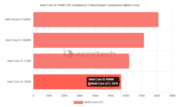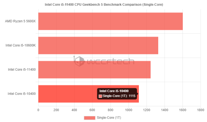 Как выяснилось, Core i5-11400 способен разгоняться до 4.4 ГГц в режиме буста, что всего на 100 МГц выше, чем у текущей модели. Тем не менее прирост производительности довольно внушительный. Так, одноядерные тесты показали дополнительные 12%, в то время как в многоядерных задачах он будет лучше на 9%.