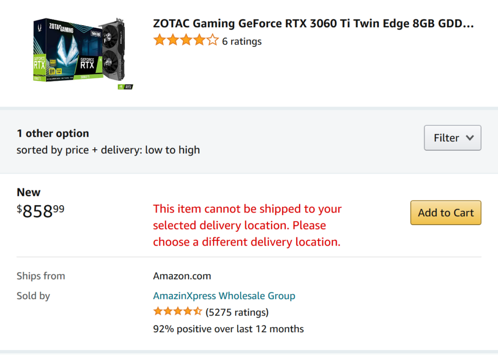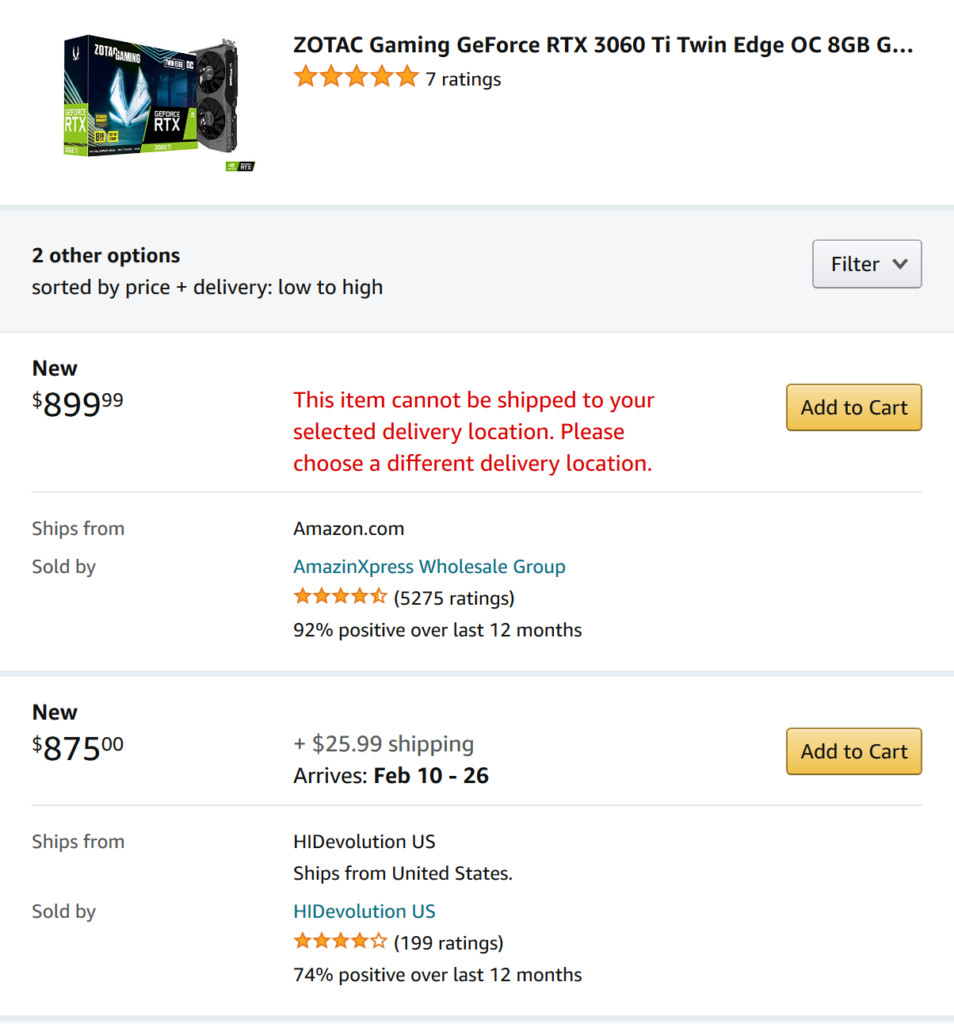 Средний ценник на площадке Amazon составляет 800-850$, а некоторые модели и вовсе продаются по абсурдной цене в 900 долларов США. По мнению Игора Валлосека с портала Igor's Lab, такой серьёзный дефицит связан с крайне малыми поставками видеочипов. Ссылаясь на свои источники Валлосек сообщил, что AIB-партнёры Nvidia получают всего 2000 кристаллов GA104-300 в месяц. Этого количества явно не хватит для удовлетворения всего спроса на RTX 3060 Ti.