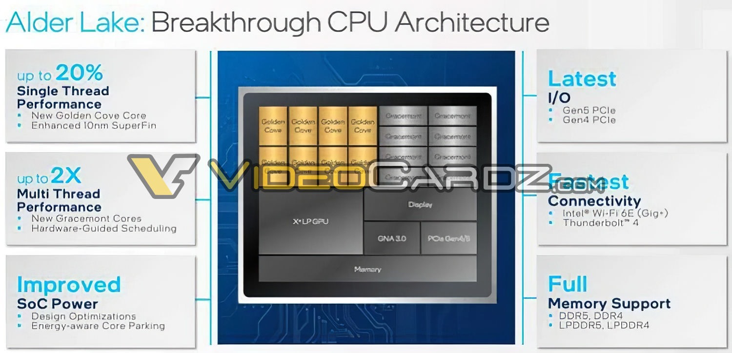 Просочившиеся в сеть слайды подтверждают наиболее важные аспекты новой архитектуры Alder Lake, включая настольные и мобильные платформы. Прежде всего, Intel заявляет о повышении однопоточной производительности до 20% благодаря новому дизайну ядра Golden Cove. Кроме того, Intel утверждает, что процессоры Alder Lake будут вдвое быстрее в многопоточных рабочих нагрузках. Здесь Intel упоминает о своих новых высокоэффективных ядрах Gracemont и встроенном в чип аппаратном планировании. Серия процессоров на 10-нм Enhanced Superfin техпроцессе будет включать гибридную технологию Intel с маленькими (энергоэффективными) и большими ядрами (высокопроизводительными). На слайде фактически представлена блок-схема с процессором, которая подтверждает, что полная конфигурация кристалла должна предлагать до 8 больших ядер Golden Cove и до 8 малых ядер Gracemont.