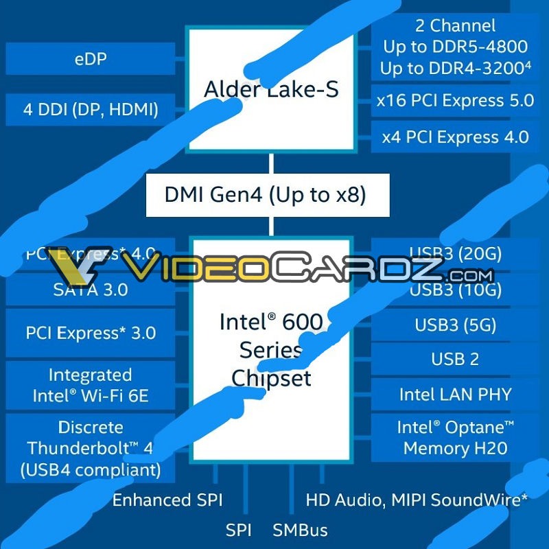 Еще одним большим обновлением является поддержка PCI Gen5. Процессор будет иметь 16 линий с поддержкой PCI Gen5, а также 4 линии PCI Gen4. Сам чипсет также будет поддерживать шины PCI Gen4 и Gen3. Также Direct Media Interface (DMI) был обновлен до Gen4. Предстоящий набор микросхем серии 500 для Rocket Lake уже расширил ширину до 8 полос, но по-прежнему основан на Gen3, как и наборы микросхем 400-й серии для Comet Lake.
