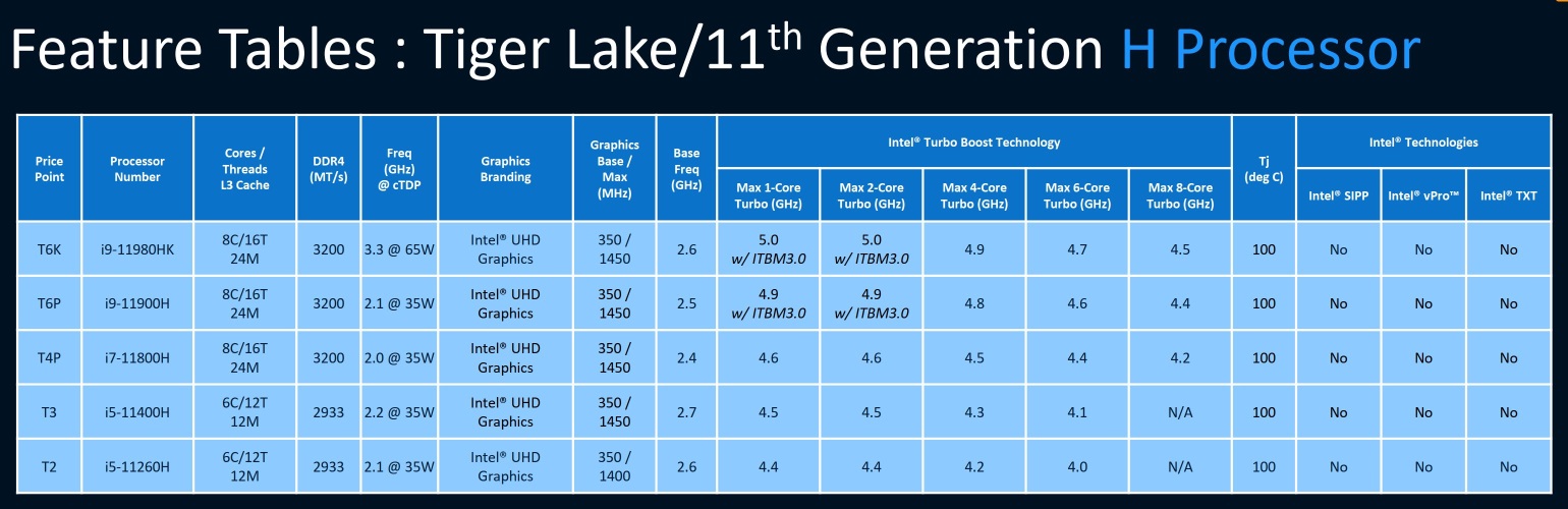 Инсайдеры @9550pro и @OneRaichu опубликовали слайд с полными характеристиками грядущей серии процессоров для ноутбуковIntel Tiger Lake-H. Процессоры Tiger Lake-H являются расширением серии Tiger Lake-H35, которые являются 4-х ядерными моделями. Теперь кажется, что пять процессоров с шестью и более ядрами завершают полный модельный ряд чипов серии Tiger Lake-H, однако, пока ничего не слышно о процессорах Core 117XXH, 116XXH или 115XXH, которые просто обязаны присутствовать в новой линейке.