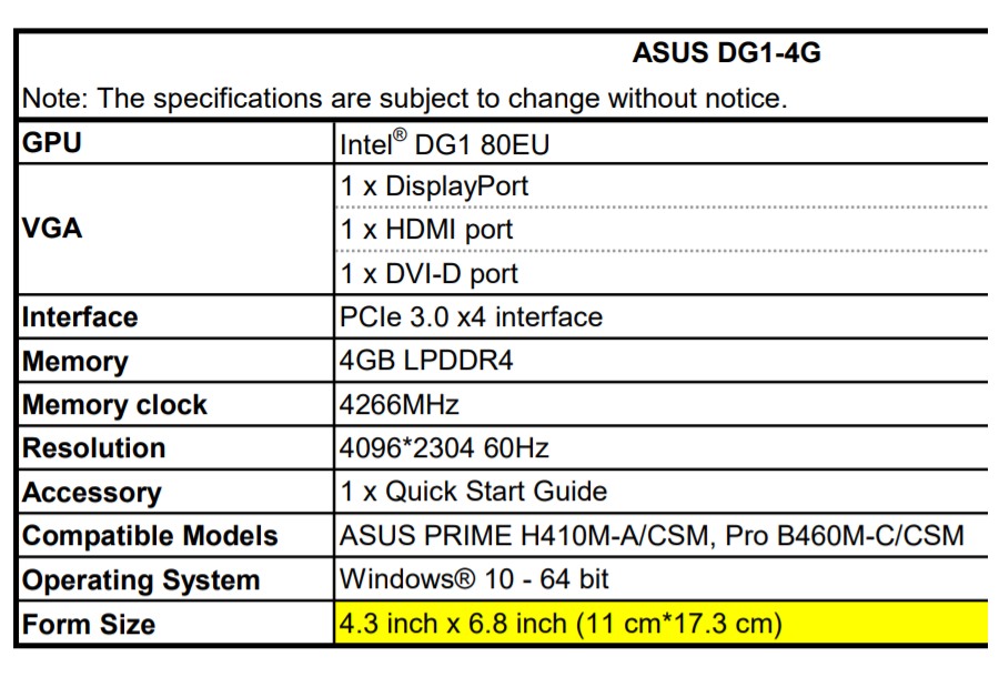 Судя по имеющимся данным, графический адаптер ASUS DG1 наделён 80 исполнительными блоками и 4 Гбайт видеопамяти типа LPDDR4 с эффективной частотой 4266 МГц. Для подключения устройства используется интерфейс PCIe 3.0 x4, а за вывод изображения отвечают порты HDMI, DisplayPort и DVI-D неизвестных версий.