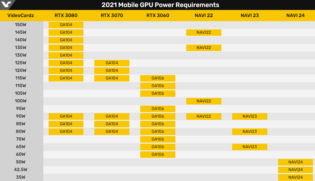 Недавно на портале Videocardz была составлена полная таблица спецификаций TGP (Total Graphics Power) для мобильных графических процессоров AMD и NVIDIA. Спецификации AMD основаны на утечках, тогда как спецификации NVIDIA в основном основаны на данных производителей ноутбуков.
