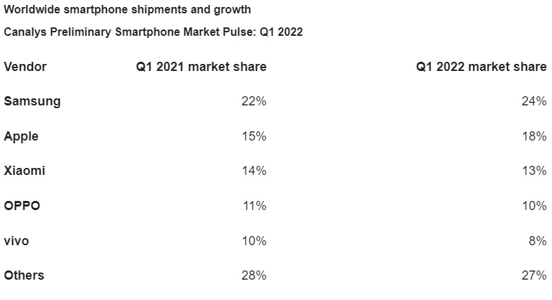 Samsung лидирует по объёму поставок с долей 24% против 19% в последнем квартале прошлого года и 22% в первом квартале годичной давности. По традиции осеннее появление нового поколения аппаратов iPhone подстегнуло их продажи в 4-м квартале. Однако, Samsung продаёт больше за счёт более позднего релиза флагманских моделей Galaxy S22 и спроса на аппараты средней ценовой категории Galaxy A.