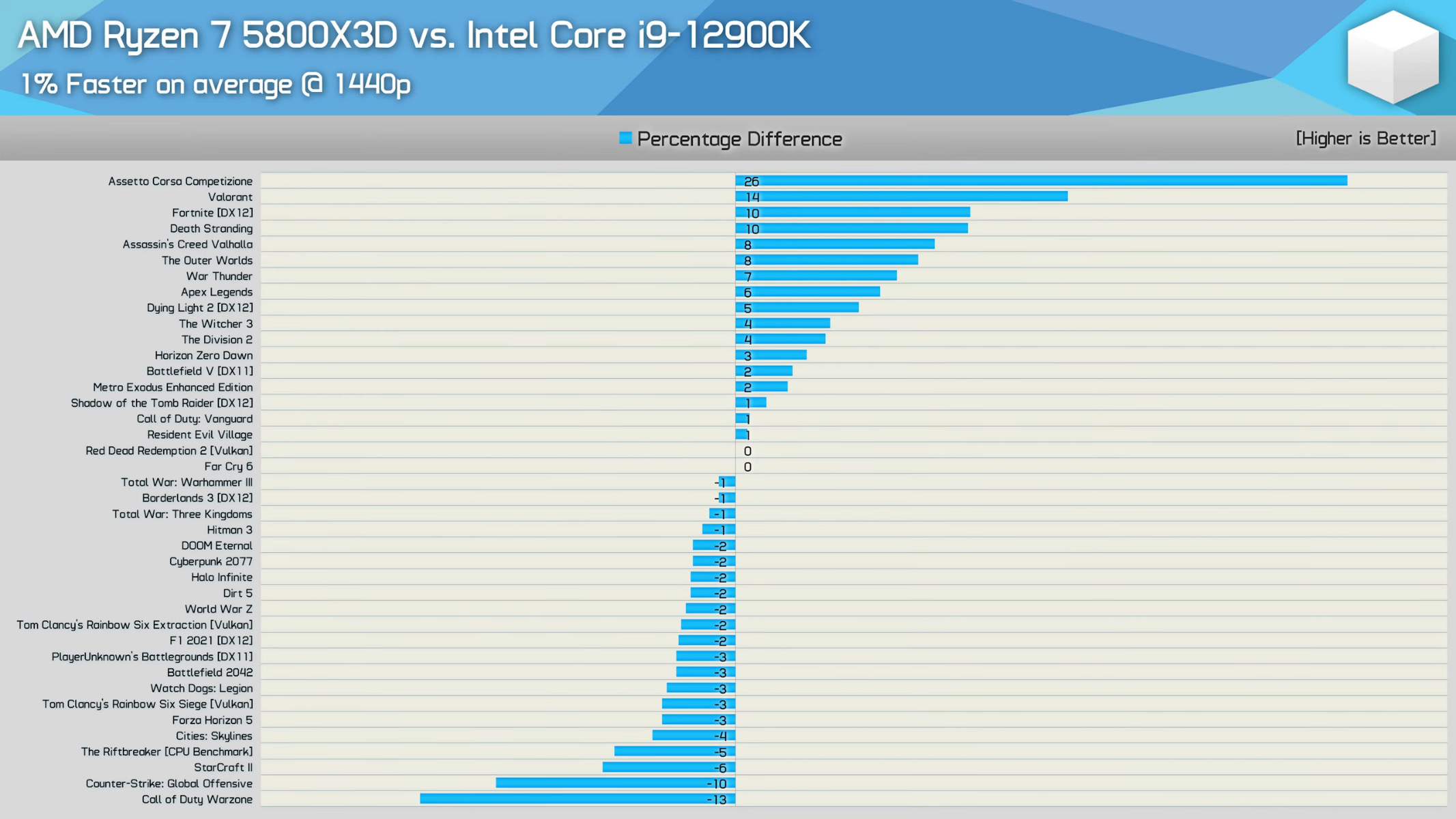 Именно это показано в недавно опубликованном обзоре HardwareUnboxed, в котором представлены 40 игр. Прямое сравнение между Ryzen 7 5800X3D и процессором Intel Core i9-12900K, в котором процессор AMD в среднем на 1% быстрее в разрешениях, проводилось при разрешении 1080p, 1440p и 2160p.
