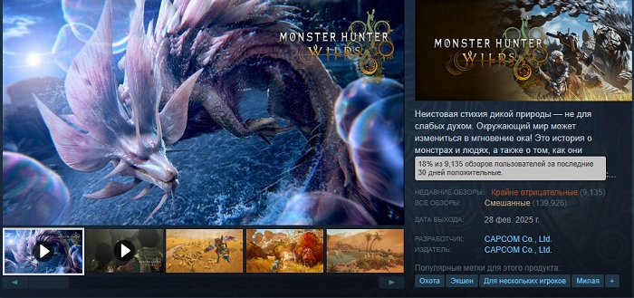 Подверглась ему и Monster Hunter Wilds, которая хоть и разошлась большим для серии тиражом за считанные месяцы, но проблемы в которой так и не решены до конца. И вот по состоянию на сегодняшний день актуальный пользовательский рейтинг Monster Hunter Wilds в Steam составляет 18 %. Средний с момента релиза пользовательский рейтинг также закономерно снизился и составил 59 %.