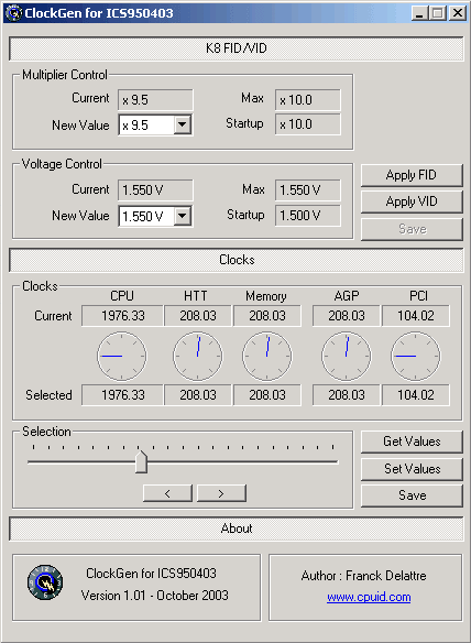 . Единственный недостаток утилиты - она будет работать только на чипсетах VIA K8T800 с генератором частот ICS950403. К счастью, большинство производимых плат именно такие.