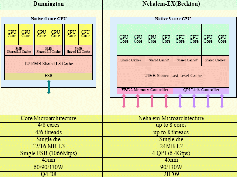 Процессоры Dunnington будут поддерживать 1066 МГц шину, они разместятся в энергетических нишах с уровнем TDP не более 60, 90 и 130 Вт соответственно. По-настоящему прогрессивным можно считать только процессор Beckton, ранее известный под кодовым обозначением Nehalem-EX. Во-первых, он будет использовать архитектуру Nehalem со встроенным контроллером памяти, характеристики которого пока уточняются. Известно лишь, что он будет четырёхканальным, и обеспечит поддержку как FB-DIMM типа DDR-2, так и регистровых модулей DDR-3.