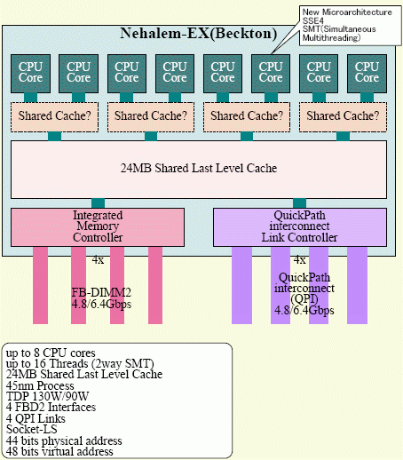 Восемь процессорных ядер на одном кристалле будут попарно использовать кэш низших уровней, а кэш последнего уровня объёмом 24 Мб будет разделяемым. Пока нет уверенности, что кэш будет трёхуровневым, но такая вероятность существует. Четырёхканальный контроллер шины QPI будет связывать процессоры с элементами чипсета и между собой. Такие процессоры появятся во второй половине 2009 года, они будут выпускаться по 45 нм технологии, уровень TDP не превысит 130 Вт. Конструктивное исполнение Beckton обозначается таинственным сочетанием символов "Socket LS".