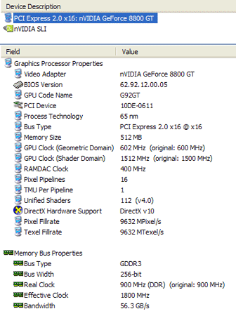 Утилита честно сообщает, что видеокарта GeForce 8800 GT с 512 Мб памяти типа GDDR-3 основана на 65 нм видеочипе G92GT, оснащается интерфейсом PCI Express x16 типа PCI Express 2.0, поддерживает DirectX 10.0 и Shader Model 4.0. Число шейдерных процессоров равно 112 штукам, на каждый из 16 пиксельных конвейеров приходится один текстурный блок. Частота ядра равна 602 МГц, шейдерный домен работает на частоте 1512 МГц. Память сообщается с видеочипом по 256-битной шине, и работает на частоте 1800 МГц DDR.