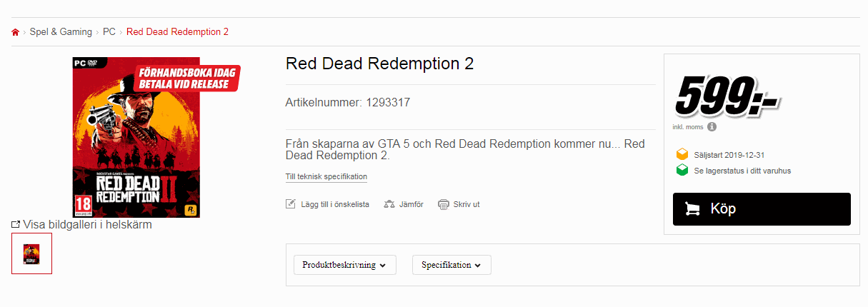 На сайте шведского отделения торгового гиганта появилась страница с описанием ПК-версии Red Dead Redemption 2 и датой выхода: 31 декабря 2019 года. Вскоре дату потёрли, но Google помнит.