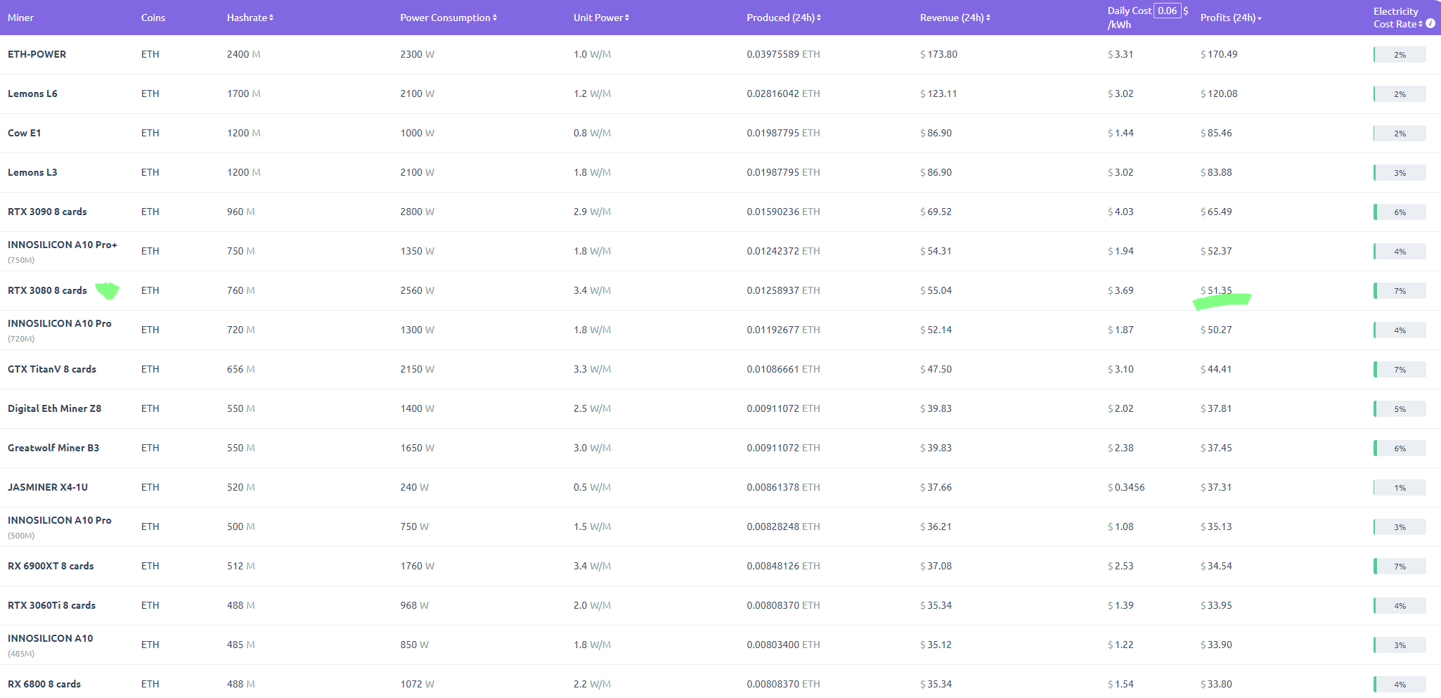 Поскольку цена Эфира прочно привязана к Биткоину, то нет никаких сомнений в том, что майнеры стали зарабатывать меньше. А вот насколько меньше, нам сегодня и предстоит выяснить. Предположим, что вы сегодня купили видеокарту GeForce RTX 3080, цена которой достигает 165 000 рублей. Прибавлять остальные элементы компьютера не будем. Если обратиться в популярный калькулятор майнинга, то выходит, что ферма из указанных выше видеокарт приносит своему владельцу 51.35 доллара. В месяц это выходит 1540 долларов на все 8 видеокарт, или 192.5 доллара только на одной такой карте за 30 дней. Если перевести это в рубли, то получим 14 тысяч рублей в месяц.