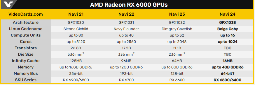 Графический процессор Navi 24 уже появился в патчах Linux под кодовым названием Beige Goby. Ходят слухи, что процессор имеет 64-битную шину памяти в конфигурации с 4 ГБ GDDR6. AMD, возможно, представит графический процессор Navi 24 вместе со своей новой серией Ryzen 6000 для ноутбуков в январе следующего года.