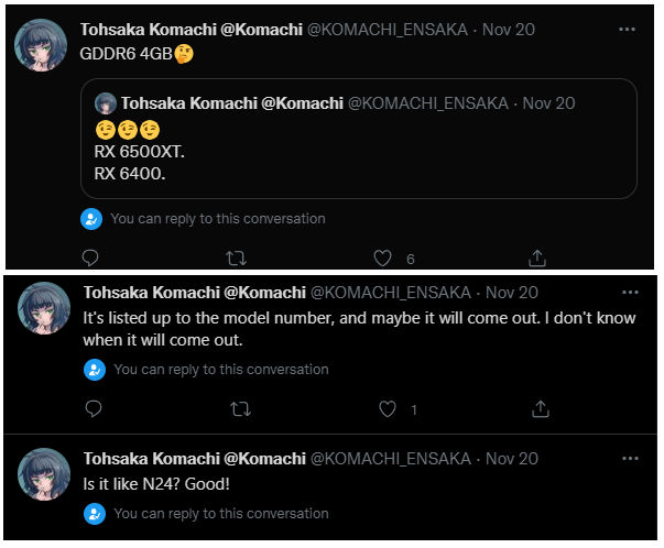 Ресурс Videocardz со ссылкой на инсайдера @KOMACHI_ENSAKA сообщил о возможной подготовке к выпуску компанией AMD видеокарт начального уровня Radeon RX 6500XT и RX 6400. Инсайдер не сообщил о своём источнике, поэтому информация является непроверенной.