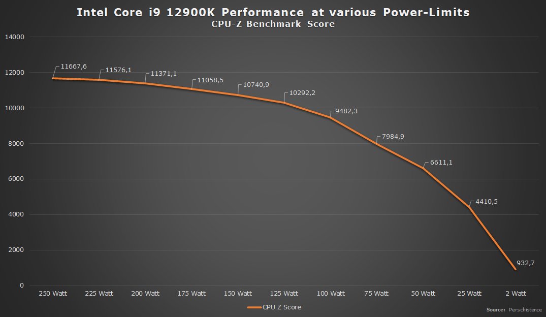Ресурс Hardwaretimes со ссылкой на 3DCenter показал, насколько падает производительность флагманского Core i9-12900K при различных уровнях снижения Power-Limit.