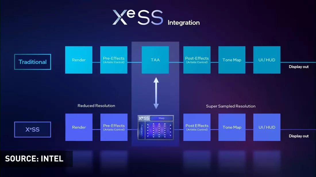 XeSS отличается как от DLSS, так и от FSR. В отличие от FSR 2 (в котором используется шейдерный код, не зависящий от графического процессора), XeSS аппаратно ускоряется с использованием матричных процессоров Intel Arc. Однако, по сравнению с DLSS, технология Intel не совсем привязана к поставщику и может работать на любом графическом процессоре - просто на чипах, помимо Intel, она использует упрощенный алгоритм, основанный на математике DP4a, вместо собственных инструкций Intel XMX. Упрощенная версия выглядит не так хорошо, как реальная, и не так хорошо, как FSR 2.1, но не каждая игра реализующая XeSS также будет иметь FSR 2.1.