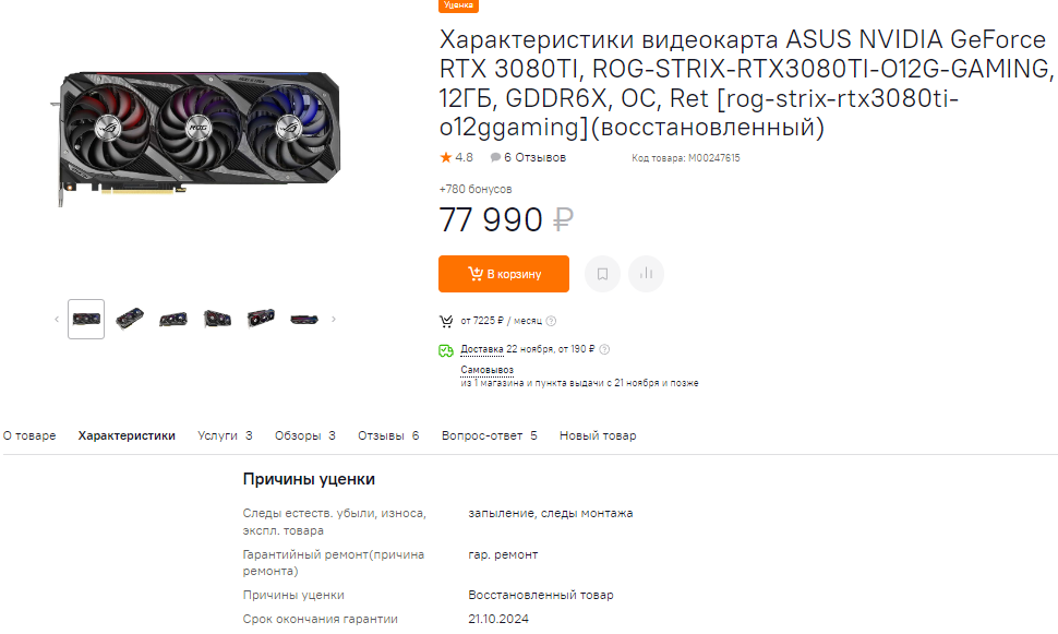 Если вы покупаете бывшую в употреблении видеокарту с рук, то даже не представляете, через что она прошла. При этом карта может оставаться на гарантии, но не факт, что будет исправна. А вот в магазине восстановленная GeForce RTX 3080 Ti и стоит дешевле, и точно работает. В данном случае был произведён гарантийный ремонт, а гарантия действует до ноября 2024 года. Отличный запас, ведь если за это время у вас что-то случится, то вы сможете получить квалифицированный ремонт либо замену абсолютно бесплатно. Ну а сама GeForce RTX 3080 Ti ещё долго будет актуальна, вытягивая любые игры в самых сложных сценариях в разрешении 4К.