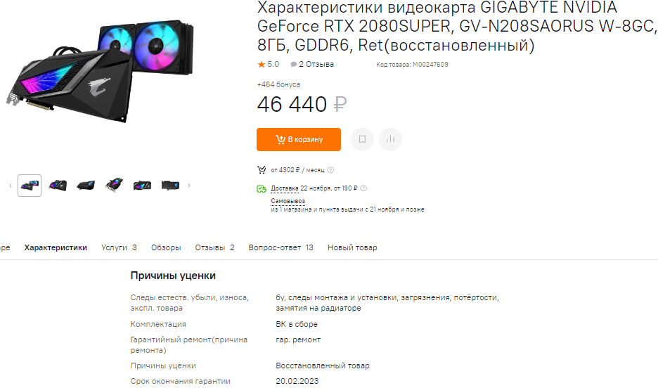 Ну или берите GeForce RTX 2080 SUPER. За 46 тысяч вам предлагается одна из самых быстрых видеокарт предыдущего поколения. Увы, не обошлось без основательных следов эксплуатации, но ведь и цена не такая высокая, как на модели выше. Гарантия подходит к концу, но здесь главная фишка заключается в полностью готовой системе жидкостного охлаждения. Это значит, что вы можете попробовать разогнать свою видеокарту, повысив тактовые частоты или скорость работы видеопамяти. Неясно, насколько много прироста быстродействия это принесёт, ну а стоит или нет покупать отремонтированную GeForce RTX 2080 SUPER, решайте самостоятельно. Проблема в том, что видеокарта действительно старая. Выпущена уже больше трёх лет назад, а куплена 33 месяца назад. Словом, всегда есть за и против, а значит стоит как следует взвесить предложение.