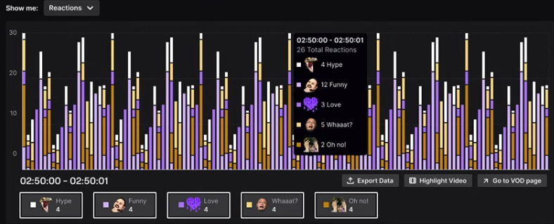Зрители смогут оставлять реакции в реальном времени, причем для того, чтобы предотвратить действия "спамеров", будет включено ограничение на два действия, после которого включается запрет на посыл реакции на пять минут. После завершения прямой трансляции стример сможет изучить каждую из реакций посланную за эфир, в том числе увидеть, кто ее послал, и в какое время. У создателей контента есть возможность перенести данные в другие приложения/сайты для дальнейшего анализа, либо они могут воспользоваться встроенным функционалом Twitch.