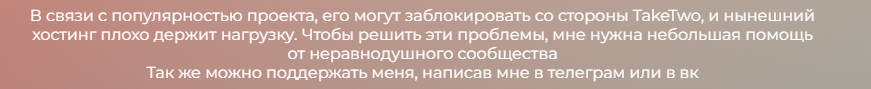 На футере(нижней части) сайта разработчик обратился к посетителям сайта, что из-за высокой популярности сайта старый хостинг стал не выдерживать нагрузок, может подвергаться DDos-атакам, а TakeTwo(студия-издатель ряда игр серии Grand Theft Auto) может поставить вопрос касаемо авторских прав контента.